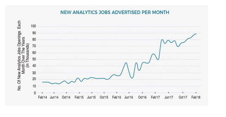 Our 360 degree understating of the Indianjob market and survey reviews reveals the fact that there is a High demand of Data Scientists and Advanced Data Analysts. As per the study from different forums and collective statistical analysis shows that there is a rise in New Analytics jobs/month approximately about 76% from April-2017 to April-2018. The number of jobs rose to twice if comparing figures from 2016-2017 to 2017-18.